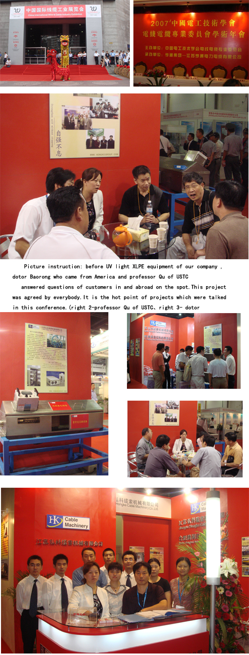 In a new feature ,our company received customers in and abroad and friends in the field of wire and cable warmly  ,and gained plentiful harvest.To bring out our new product of UV light XLPE equipment better,our company showed the sample machine.Many customers were very interested in it. Customers  in and abroad came to inquire and talk in an endless stream.  Doctor Baorong who came from America and professor Qu of USTC answered questions of customers in and abroad on the spot.This project was agreed by everybody.It is the hot point of projects which were talked  in this conference.